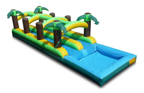 Mini Palm Trees, Dual Lanes, Pool on the Back End = Lots of Water Action! This open top, dual lane slide sprays out some serious water from the hoses that runs in the middle of both inner dividers! Water goes everywhere and the kids won't go in the house for hours!